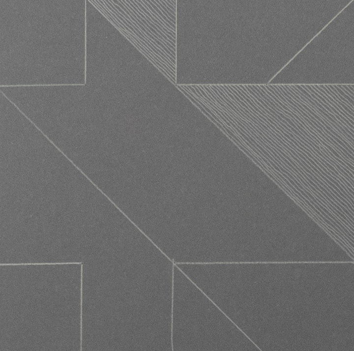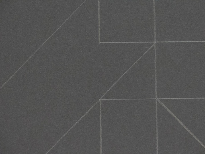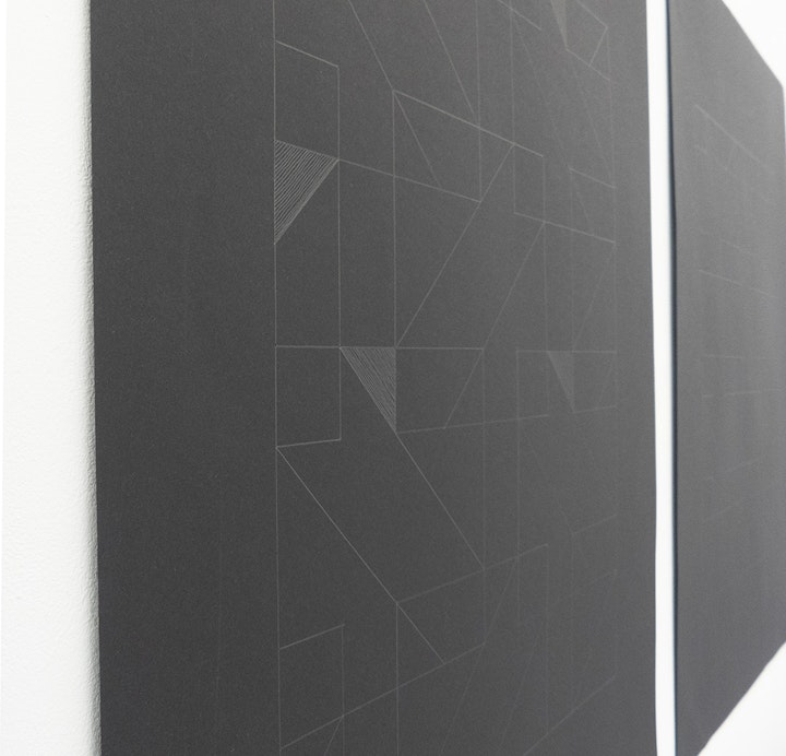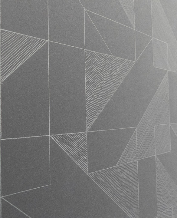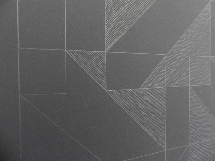 Using a fading, diminishing motif, these drawings lose any pretence at colour, even black, instead infilling straight-edged blocks with hand-drawn graphite. The graphite is both seen and unseen, a metaphorical connection with ancient marks, some of which are revealed, but most of which will never be seen.